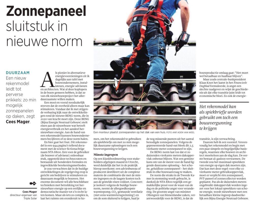 De nieuwe BENG norm leidt tot perserve prikkels: zo min mogelijk zonnepanelen op daken zonnepaneel sluitstuk nieuwe norm Categorie: Algemeen25 april 2019 Delen via Delen op LinkedInDelen op LinkedIn Delen op FacebookDelen op Facebook Delen op WhatsAppDelen op WhatsApp Bericht navigatieVorigeVorig bericht:Haarlems klimaatakkoordVolgendeVolgend bericht:Top 100 meest innovative bedrijven 2019Vergelijkbare berichtenISDE-subsidie voor water/water-warmtepompen blijft in 2025 gelijk23 december 2024Hoe Frans en Bert er met de Kerst warm bij zitten dankzij Triple Solar18 december 2024Ik heb al zonnepanelen, dus ik kan geen PVT-systeem meer plaatsen12 december 2024Slim besparen en duurzaam wonen: Nieuwe energieoplossingen voor sociale huurders10 december 2024In Veldhoven experimenteert woningcorporatie Woonbedrijf met warmte uit de zon29 oktober 2024