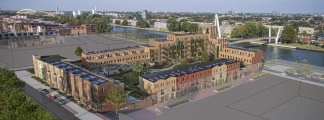 In Arnhem wordt voormalige restaurant ‘De Rijzenburg’ en ontginningsboerderij verbouwd tot duurzame zorgappartementen met PVT-panelen.