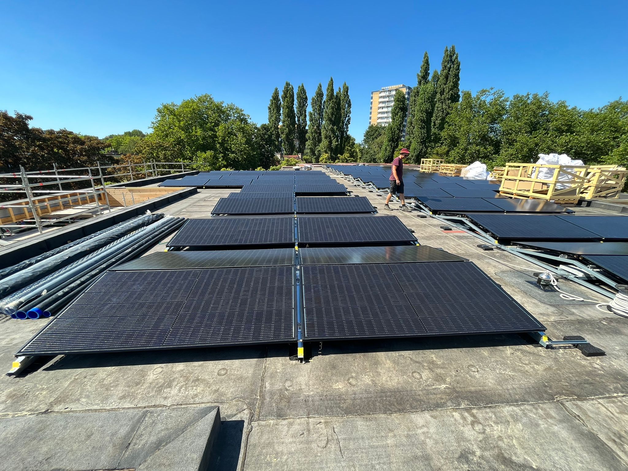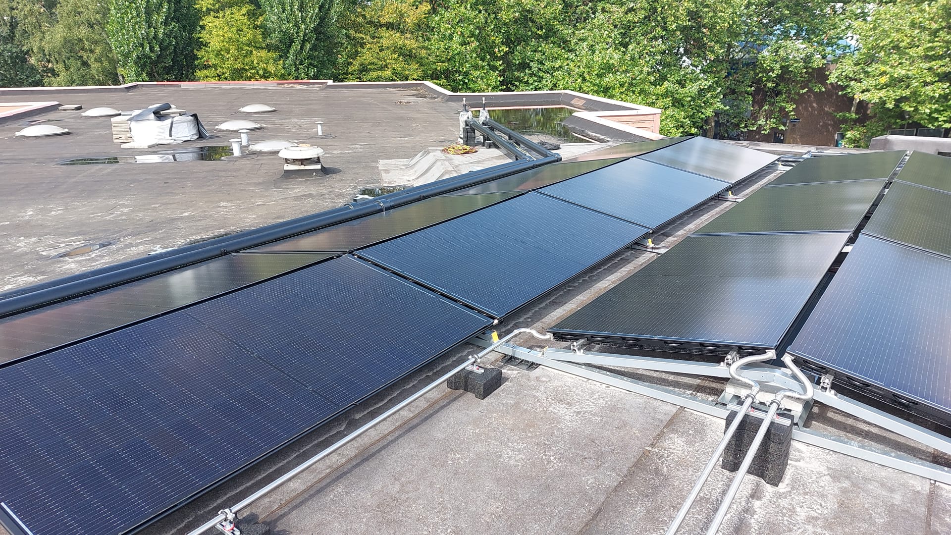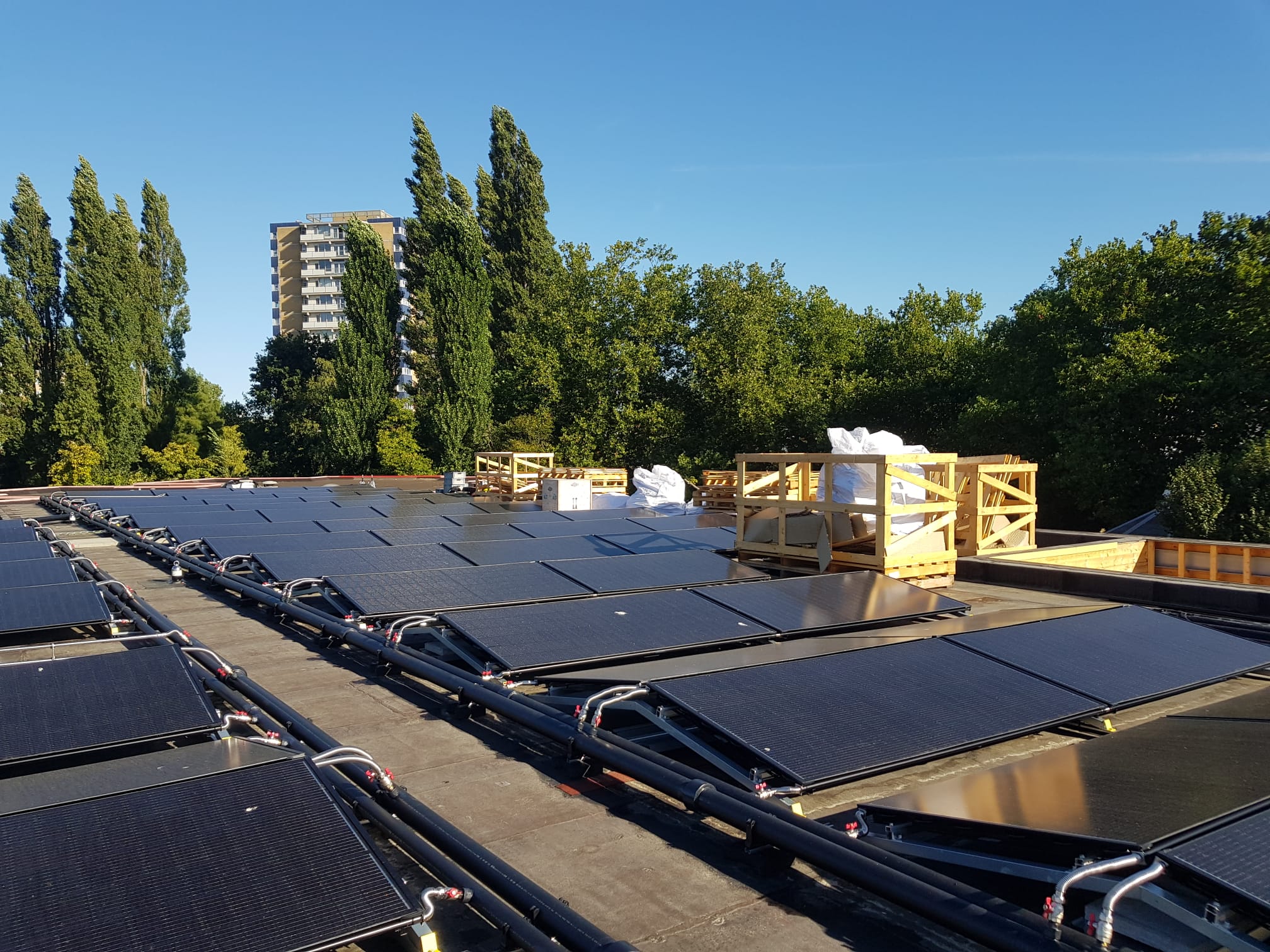 Basisschool De Wijde Wereld in de Haarlemse Schalkwijk is circulair gerenoveerd en klaar voor de toekomst. Het schoolgebouw was er niet goed aan toe. Renovatie was dan ook geen voor de hand liggende optie. Maar dankzij een innovatieve, circulaire gevel blijft de school behouden. Het gebouw krijgt een nieuwe buitenkant op basis van een Fins houtbouwsysteem. Ook is het gebouw gasloos en wordt nu verwarmd door twee 53,4 kw warmtepompen gekoppeld aan 130 Triple Solar PVT-warmtepomppanelen 450 Wp (2,13 x 1,055 m).