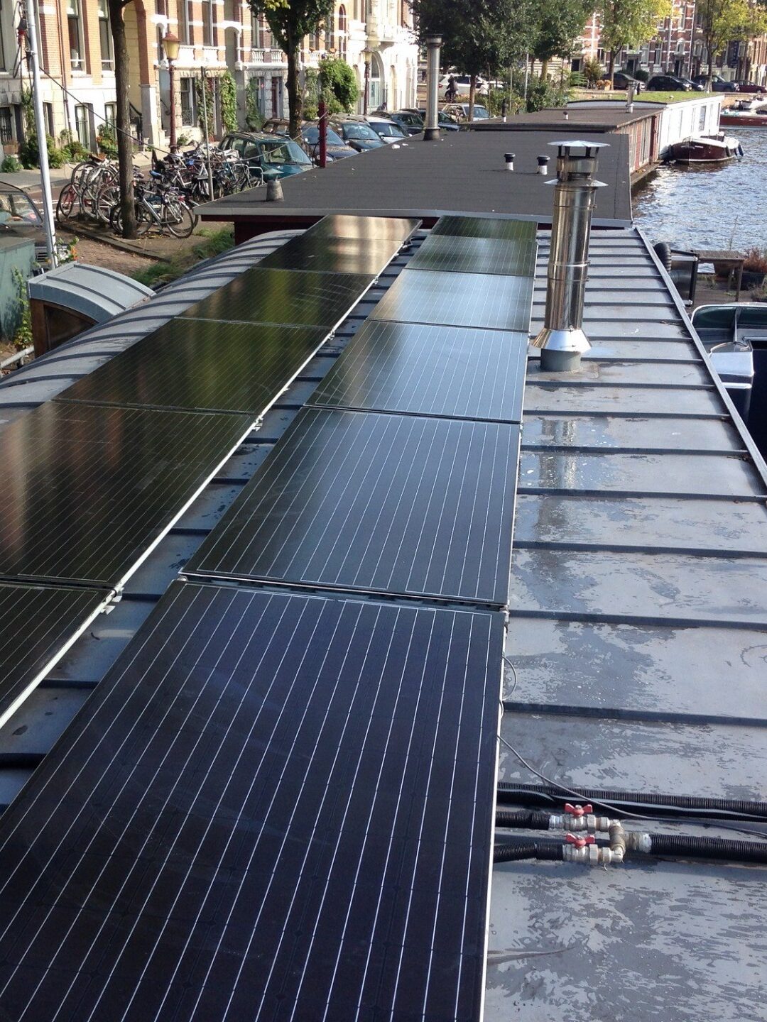 De montageframes zijn met speciale klemmen aan de felsen van het zinken dak bevestigd. Omdat er niet veel luchtbeweging is in het centrum van Amsterdam heeft Triple Solar twee extra PVT-panelen geplaatst. Om een energieneutrale woonark te maken zijn ook nog vier extra PV-panelen geplaatst.