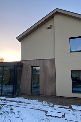 Er is gebouwd met duurzame, circulaire en zoveel mogelijk natuurlijke materialen. De bestaande woning is volledig ingepakt met een nieuwe isolerende schil bestaande uit cellulose, houtvezel plaatmateriaal en triple beglazing. Aan de buitenzijde is kalkstucwerk van KEIM toegepast. Maar ook in huis is er bewust gekozen voor gezonde en duurzame toepassingen, zoals leemstuc.