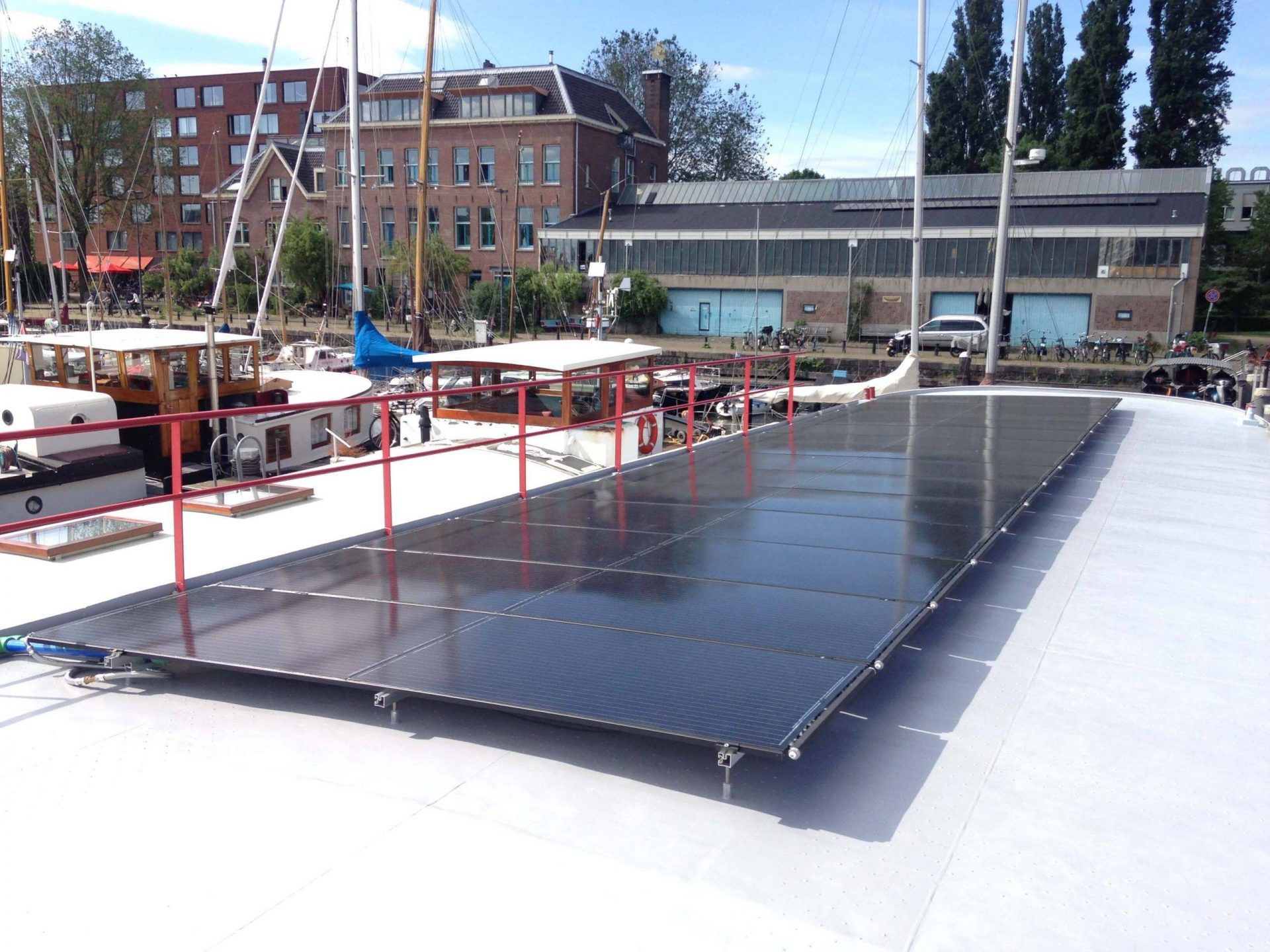 Na de noodzakelijke isolatiemaatregelen kiezen Ingeborg en Renze voor een modulerende warmtepomp die exact de benodigde warmte produceert. Omdat de pomp deze warmte direct aan de verwarmingsbuizen levert, blijkt een buffervat niet nodig. Dat scheelt zo’n duizend liter aan ruimte en gewicht in de drijvende woning. Op het dek van het schip liggen Triple Solar PVT-panelen. Deze panelen zijn de warmtebron voor de warmtepomp. Ook leveren ze elektriciteit.