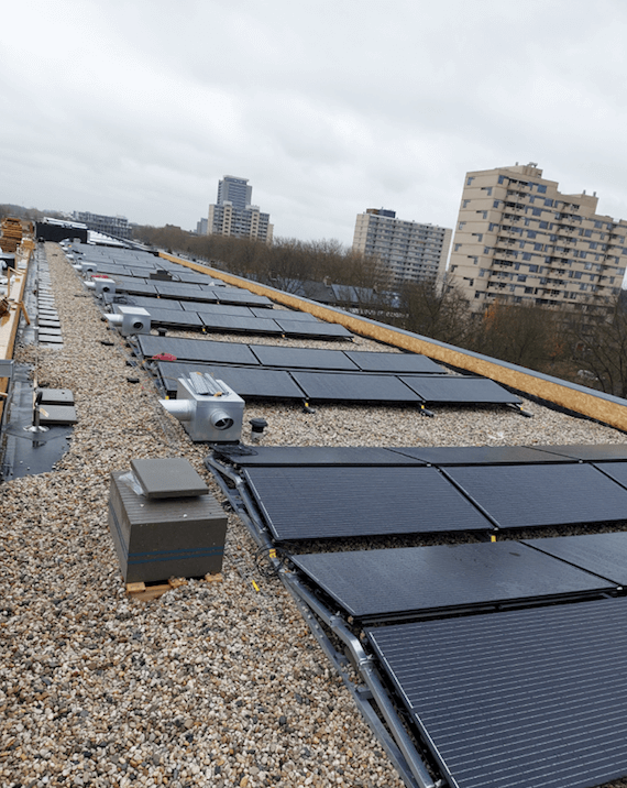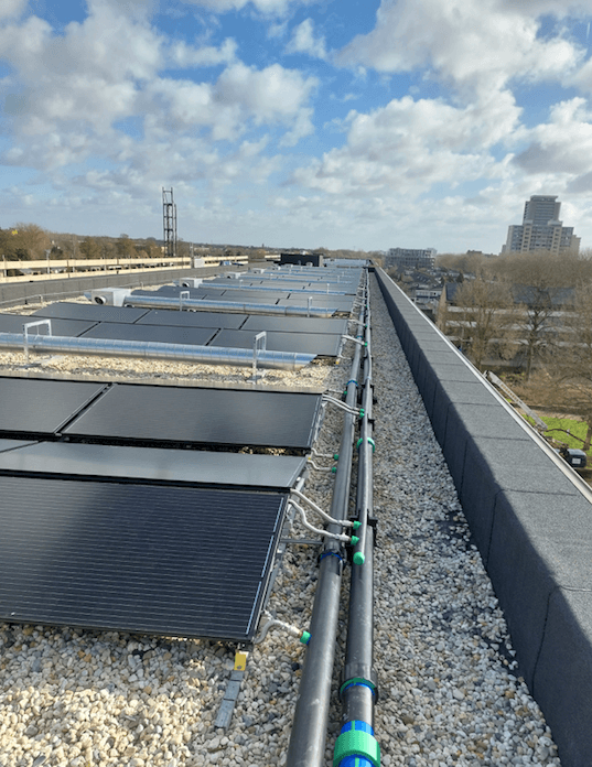 In opdracht van Dura Vermeer hebben we 120 PVT-panelen geplaatst. Het gebouw wordt circulair gebouwd en volledig gasloos uitgevoerd, voorzien van een WKO-installatie en Triple Solar PVT-panelen met extra zonnepanelen. De warmtepomp is van Ecoforest (ecoGEO HP1-25-100kw).