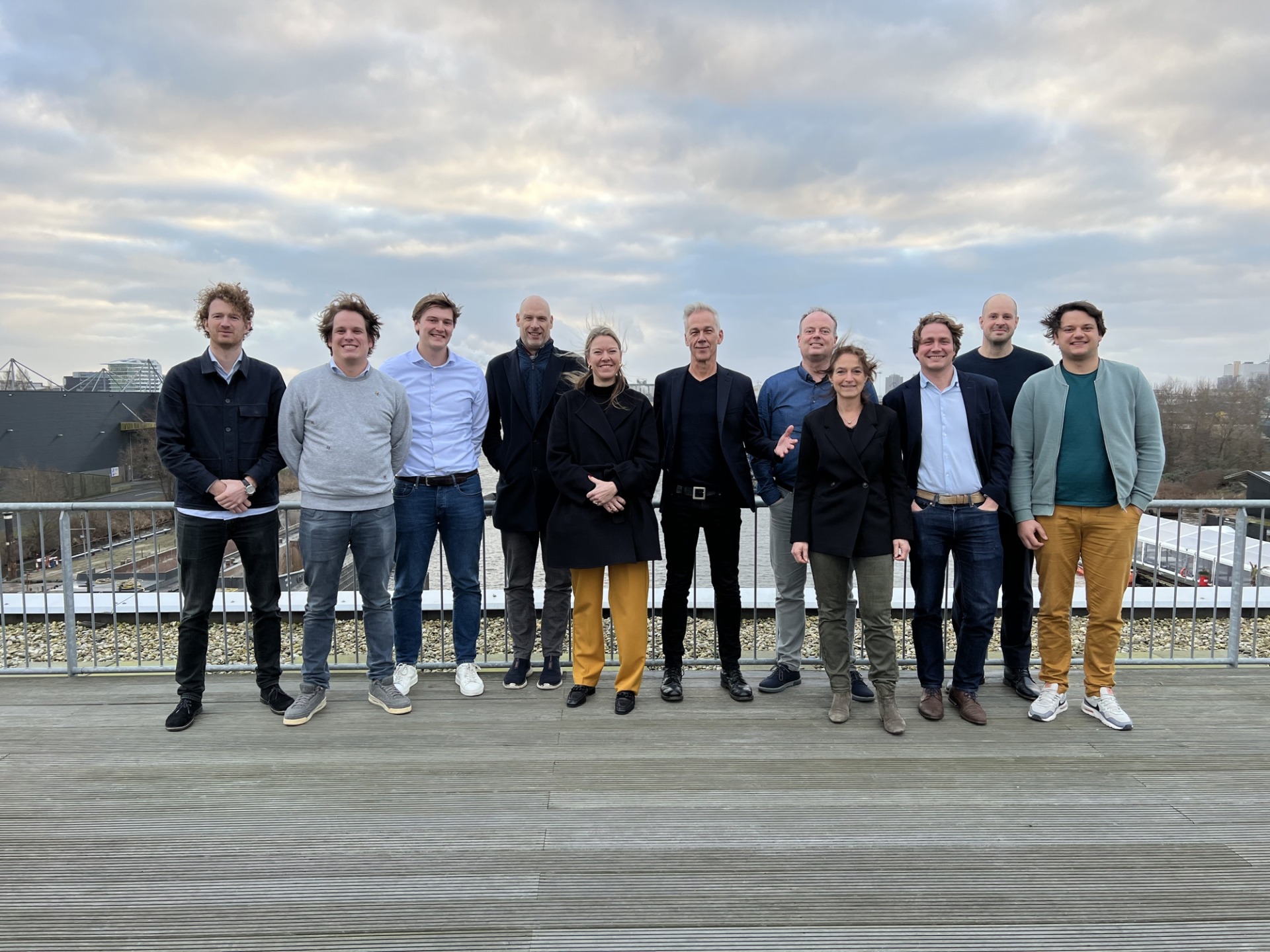 Vlnr: Ward Wolters (DOEN), Rutger van Wersch (APG), Laurens Wouda (APG), Jeroen Schreurs (APG), Dominique Dijkhuis (Uitvoerend Bestuurder Beleggingen en Financiën ABP), Cees Mager CEO Triple Solar, Erik Schut (Enfuro), Renate van Drimmelen COO, Anthony Viellevoije (PDENH), Jorrit Lootsma CMO, Frank van Maanen CTO