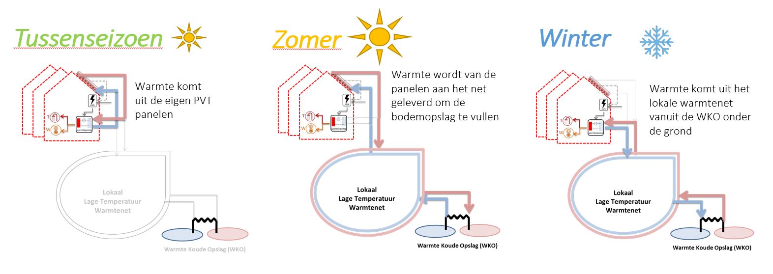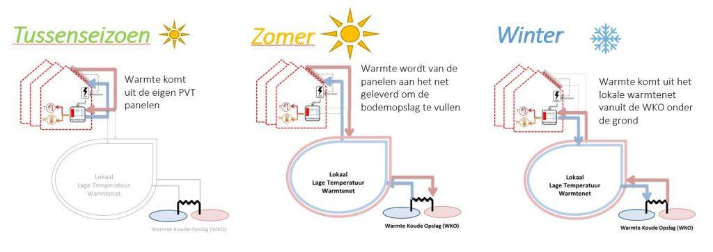 Warmtenet met PVT-zonnepanelen: Het decentrale feed-in zonnewarmtenet deZONNET is een lokaal warmtenet voor de nieuwbouw en omvat de transformatie van bestaande gasgestookte naar gasloze wijken. Alle woningen hebben Triple Solar PVT-panelen op het dak en leveren elektriciteit en bronwarmte aan een warmtepomp. In de zomer is er warmte over: deze wordt via een warmtenet afgevoerd en in de WKO (Warmte Koude Opslag) in de bodem opgeslagen. In de winter als de PVT- warmtepomppanelen niet voldoende warmte leveren voor de warmtepomp, wordt de opgeslagen warmte uit de bodem gehaald en via het warmtenet aan de warmtepompen in de woningen geleverd. Dit leidt tot een aardgasvrije oplossing en tegelijk tot een directe maximale besparing van CO₂.